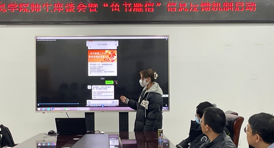 为了进一步了解学生的学习、生活情况,思想动态和需求,更好的倾听学生的心声,11月9日信息学院在瀚学楼1014会议室召开师生座谈会暨“鱼书雁信”信息反馈平台启动会,学院党委副书记陈卫、团委书记杨和家及2022级、2021级学生代表参加座谈。座谈会旨在充分了解疫情常态化防控状态下学生的思想动态和学习生活情况,并利用学院NCUT信息青年公众号平台启动“鱼书雁信”信息反馈机制,畅通学生信息反馈渠道,解决学生实际诉求。会前...