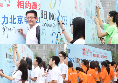 参与活动的师生在郭书记的带领下,在活动背景板上签下名字,并围绕足球场慢跑,以实际行动支持北京申办2022年冬奥会。大家纷纷表示,申办2022年冬奥会是中国人民的一件大事,是中国再次向世界展现魅力的好机会,我们应该以实际行动全力支持。