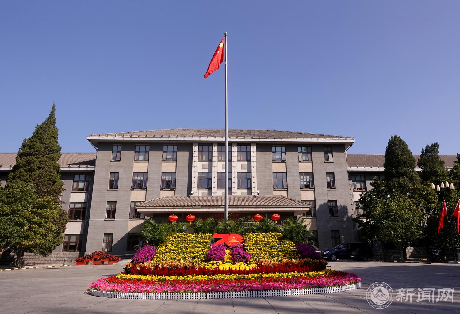 敦品楼前,鲜艳的五星红旗迎风飘扬,国庆花坛里美丽的鲜花争相斗艳。