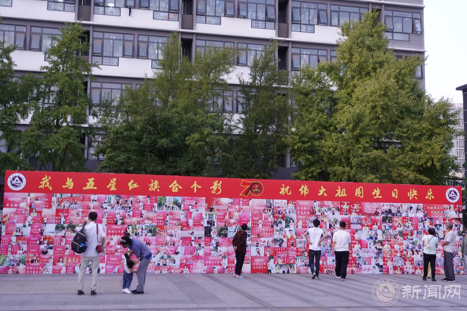 主题展板前,师生纷纷驻足,与五星红旗合个影,祝伟大祖国生日快乐。