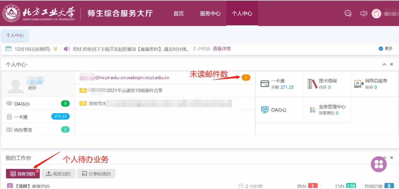 “师生综合服务大厅”(http://service.ncut.edu.cn/),为一站式网上综合服务平台,实现一次登录认证畅行众多系统,如OA系统、研究生成果认定、教务系统、邮件系统、学工系统、网络教学平台等27个系统,老师和学生点击系统图标,不用二次登录,直接跳转至应用系统内部;提供多种业务办理流程,包括协作单位入校申请、学生出校申请、体育馆一层羽毛球预约、学生体测预约申请、选课等51个流程,老师和学生在校内办理相关申请和事务时,申请人只需在“服务大厅”内提交申请,系统将自动推送到相应的审批人处进行审批或办理,办理完成或需要申请人做补充处理时,系统都会向申请人自动推送提醒,申请人也可以随时在“服务大厅”了解流程审批进度,再也不需要奔波于学校各部门间签字盖章。