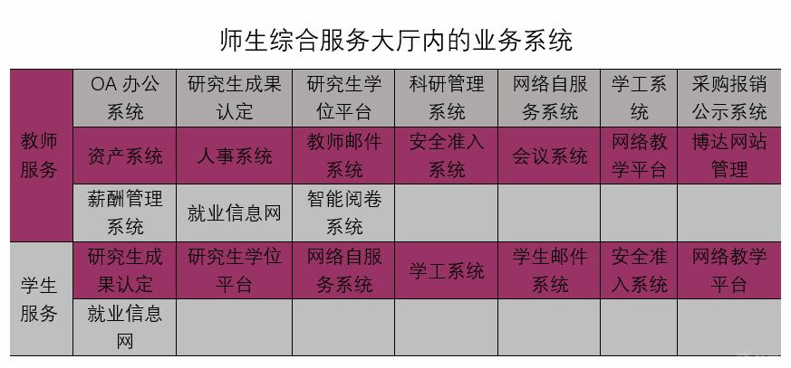 “师生综合服务大厅”既是学校的综合信息门户,也是学校的网上办事服务大厅和通讯平台。它不仅要高度集成与学校管理工作相关的教务系统、科研系统、学工系统、OA系统、财务系统、人事系统、财务系统、资产系统、图书系统等多个业务管理系统,还要实现基于流程定义的“碎片化”业务服务,它将是集师生学习、行政办公、师生事务查询、在校生活信息服务为一体的服务平台。下一步,网信中心将进一步整合各部门管理服务资源与数据,推动线下业务向线上转变,实现电脑端和手机移动端同步运行,加快服务流程建设,实现面向师生的校内服务“应上尽上、全程在线”,用最简的流程、最短的时限、最优的服务提高师生网上办事效率,提升校内事务管理服务水平,真正实现“服务零距离,办事一点通”。