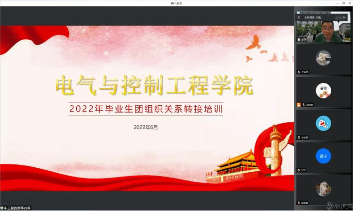 为规范毕业生团组织关系转出的工作,实现毕业生团组织关系的顺利转出,6月9日,电气与控制工程学院召开2022届毕业生团关系转接线上培训会,学院党委副书记王磊、各班团支书、班长、毕业生团员参加本次培训会议。